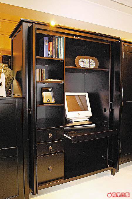 設計師巧妙地將衣櫃外形設計成書枱組合,打開門,內裏附設層格、拉出式鍵盤層板及抽屜。將兩側的木門拉出關上,立時變成一個古舊款式的衣櫃,美觀高雅。