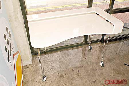 枱面用上立體設計同弧形線條,枱腳用上三支幼鋼作支撐,同樣有高度透視及空間感。枱腳裝有膠轆,可隨意搬動。膠轆有保險鎖,Lock住唔怕周圍郁。