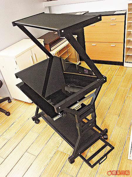金屬支架配合強化玻璃枱面及拉出式層板,設計輕盈,重量比木製書枱輕。附有膠碌易於搬動,枱的上下均附有層板可放書本雜誌,枱側有伸縮式金屬架,用來放電腦主機啱啱好。