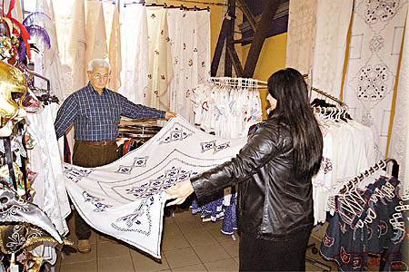 上二樓,就覺得似九龍城街巿,賣傳統衣衫,對遊客而言有噱頭。通花茶墊、玻璃杯、小木偶、洋娃娃排山倒海。花式刺繡的民族服,大中細碼齊備。布質細軟,只不過細碼我也嫌大。惟有轉投輕巧的手信堆中。