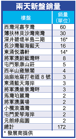 【本報訊】賣地在即,過去兩天已有買家偷步入市,其中西灣河嘉亨灣,便有投資者於賣地前,斥逾1.5億元,購逾30伙。其他發展商則惜售單位,深井碧堤半島二期周末只推2層,計劃賣地後加價。過去兩天新盤共錄得172宗成交,較前周增加7.5%。