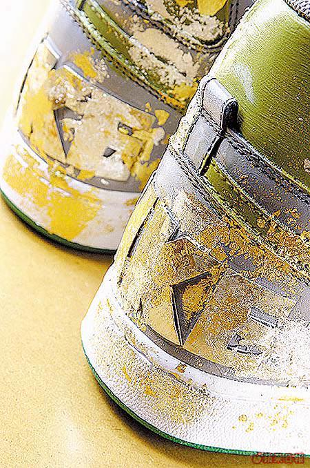TerminatorsCamo與TerminatorsGoldleaf差不多,同樣用上金箔,但故意鋪得不平均,造成Raw的感覺之餘,再襯以鞋身的綠色造成金色迷彩的視覺效果。