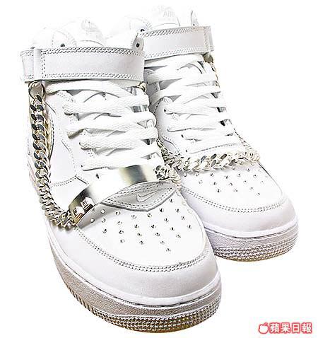 Hoodwink系列四對鞋之中最貴的一對,兩隻鞋上分別配有兩條份量十足的銀鏈,鞋頭更用上水晶,加上白色的AirForceHip-Hop味極重,如美國出售應該幾受歡迎。