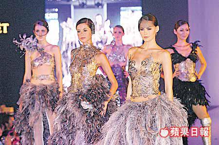 而台灣設計師黃淑琦的作品充滿sexappeal,超貼身的喱士上衣配襯立體豐盈的羽毛裙襬,形成強烈對比。