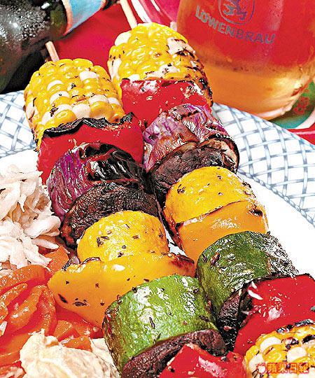 素菜兩串上,份量相當夠,色澤鮮豔,材料有意大利黃瓜、菇菌、粟米等等,加上橄欖油、鹽炭火燒烤,原汁原味,適合全素食者。