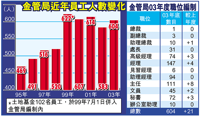 截至去年底,該局員工總數為604人(見表)。據悉,雖然去年該局亦有約20人離職,但流失的人手主要屬文員及較低級職員,今年是該局繼2000年單一年度曾流失10%人手後,久未出現的中層管理流失現象,迄今離職的,包括1名外事處主任,及1名休假中、行將離職的銀行監理處處主任,另外流失職級包括高級經理、經理及助理經理。截至9月底,流失率雖未足5%,惟不排除在未來一季仍有人手流失。