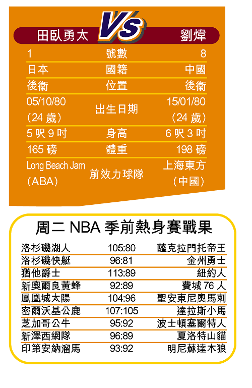 另一邊廂,與劉煒同是二十四歲的田臥勇太,雖然因大腿受傷不能在近兩場太陽的季前賽上亮相,但他在首場季前賽對快艇時,上場十九分鐘錄得兩分、兩次助攻及兩個偷球。