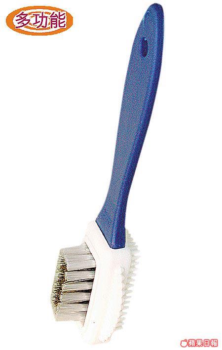 這個貌似牙刷的多功能麖皮刷,結合清潔及梳理兩種功能。底面的膠及豬鬃毛刷可清潔及梳理鞋面,而刷邊呈鋸齒狀的半圓膠片,則可清理埋藏在車縫位的污迹,夠晒深入。