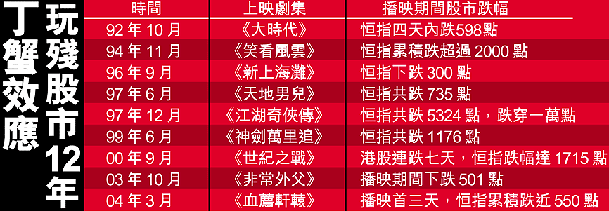 其實今年由秋官主演的《血薦軒轅》播出後,港股亦曾急跌,就連外資大行里昂證券也湊熱鬧,就秋官過去十二年主演的九部電視劇與港股走勢作出分析,數據顯示股市在同期會下跌零點一巴仙至二十五巴仙不等,而「丁蟹效應」每每在劇集播出約一半至三分之二後,恒指便會見底,之後股市亦有機會反彈。