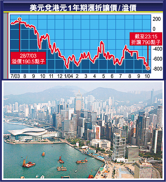 【本報訊】人民幣升值的揣測揮之不去,觸發原來持有美電長倉的套息盤,不敢再「長揸」,恐妨人民幣一旦升值,引發包括港元在內的亞洲貨幣連環飆升。美電現貨及期貨昨日出現大量沽盤,1年遠期美電折讓價最闊曾見800點子,是金管局自96年有紀錄以來,1年遠期港滙所見的最強水平。