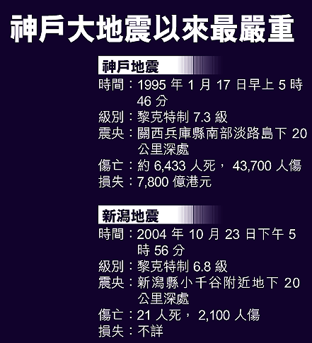 日本新潟縣這次地震威力驚人,搖晃強度甚至超過一九九五年的神戶大地震。日本氣象廳周日警告,新潟地區未來三日發生震度相約餘震的機會,有百分之十。