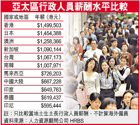 人力資源顧問公司HRBusinessSolution(HRBS)在七月份訪問了四百七十間大型跨國企業的七千二百六十一名行政人員,了解他們的薪酬福利水平。結果發現,在港土生土長的行政人員,每年的整體收入平均高達一百五十萬元,在十一個亞太地區中排行榜首,其餘依次為日本、澳洲、新加坡及台灣,中國大陸則排第八位。調查預測,本港行政人員明年的薪酬增幅為百分之二點一,較今年的一點五略高,但比起其他區的增幅則明顯遜色。