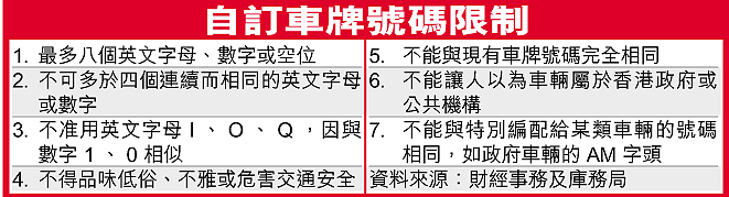 財經事務及庫務局提交立法會財經事務委員會的文件,交代了自訂車牌號碼計劃的具體安排建議,當局決定,由車主自由選擇然後透過拍賣所得的車牌號碼可以轉讓,車主申請自訂車牌,須先繳付二萬元按金,而該二萬元也將成為拍賣的底價,如拍賣時無人競投,車牌便會以二萬元編配給申請人。