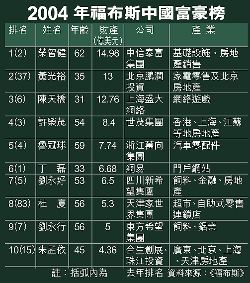 二○○四年《福布斯》中國富豪榜昨日揭曉,中信泰富集團主席榮智健以十四點九億美元(約一百一十六億港元)的財富,成為中國首富。而在另一個較早前公布的富豪榜名列首位的「電器大王」黃光裕,則從去年的三十七位躍升至今年第二位。