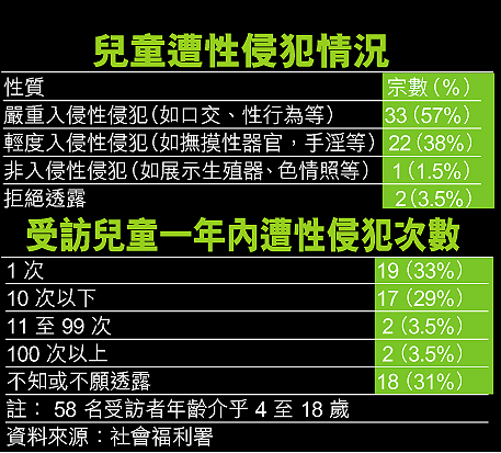 社署九九年共接獲二百一十宗兒童遭性侵犯的新個案,社署臨床心理學家馬綺文和尤卓慧抽取了當中的五十八個案件進行深入研究。這批被性侵犯的兒童年齡由四至十八歲,五十六人是女孩,兩名是男孩。近四成兒童被性侵犯的年期達兩至九年,大部份孩子每年被性侵犯十次以下,但有兩名女孩在一年之內,不幸遭親人撫摸性器官、作「入侵性」侵犯逾一百次。