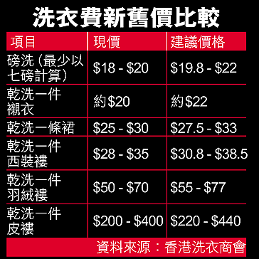 另一間大型洗衣連鎖店恒隆白洋舍,其高級營業經理陳小萍表示,受到油價上漲影響,公司今年七月已加價,加幅約半成;但部份如領呔等物件則減價半成。