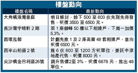 業內人士估計,隨着長沙灣宇晴軒2期及碧海藍天近期獲市場支持,恒基遂再推港灣豪庭發售。長實(001)高級營業經理郭子威表示,宇晴軒2期1座御峰50樓以下相連戶,下周一提價5.3%。