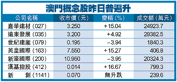 澳門概念股炒風昨日稍為收斂,其中連升3天的新濠國際(200)及世紀建業(079)均出現獲利回吐。不過,可能獲大股東注入賭業的嘉華建材(027)則續創新高,收市報3.25元升15%,成交高達2.49億元。