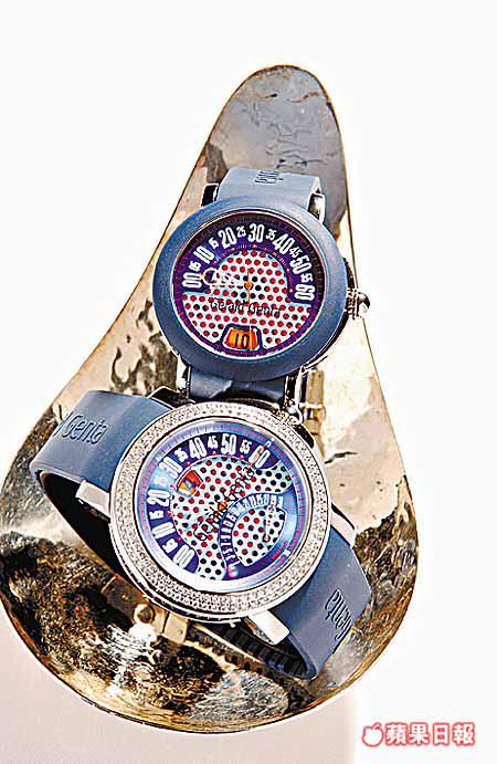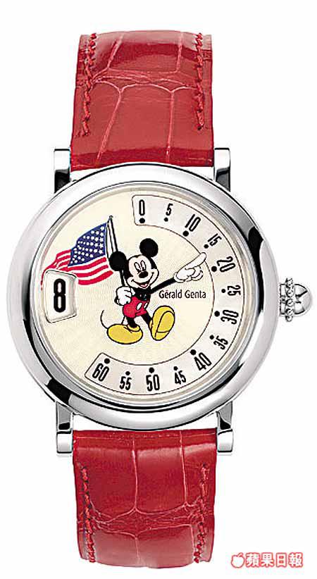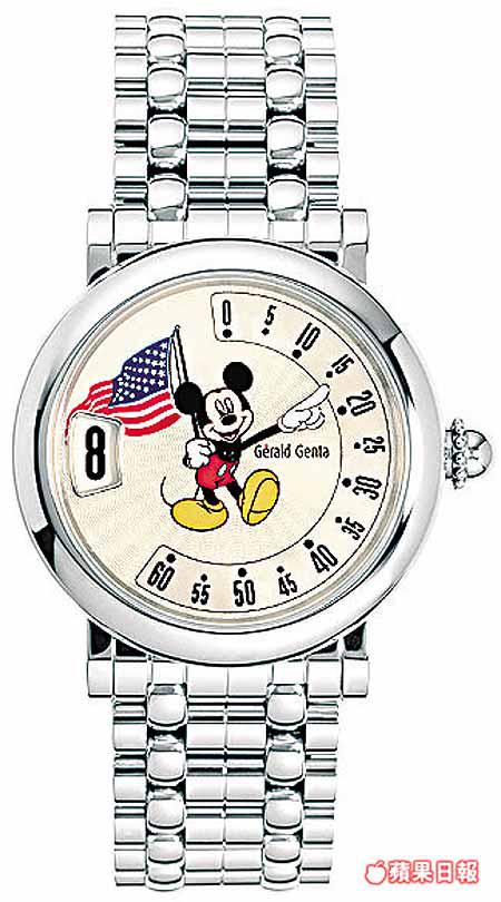 今年適逢米奇老鼠七十五歲生日,GeraldGenta特別推出兩款以米奇及米妮為造型的「UnlimitedFantasy」腕表,米妮身穿白色波點裙、米奇則手持國旗,不同國家版本配上不同國旗及服飾,如日本旗和美國旗等,而在港推出的中國版,米奇將穿上唐裝,用上中文數字作時間顯示,預計下月抵港。