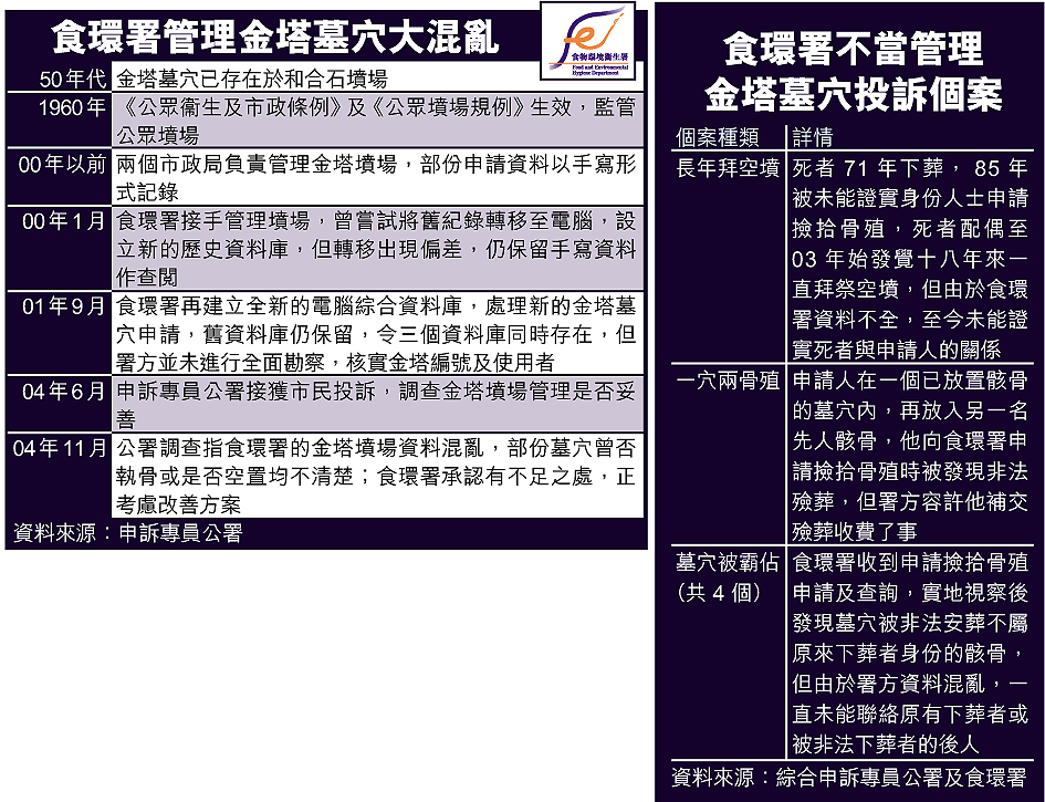 申訴專員戴婉瑩昨批評,食環署一直未考慮於金塔墓地進行全面勘察,改善現有資料庫,亦未做到打擊售賣金塔墓穴的非法勾當,「不能達到先人入土為安原則。」負責調查的申訴專員公署高級調查主任鄧健章亦形容,食環署在調查初期表現得不甚積極,「態度漫不經心、近乎麻木不仁」,對亡者及其後人有違道義責任。