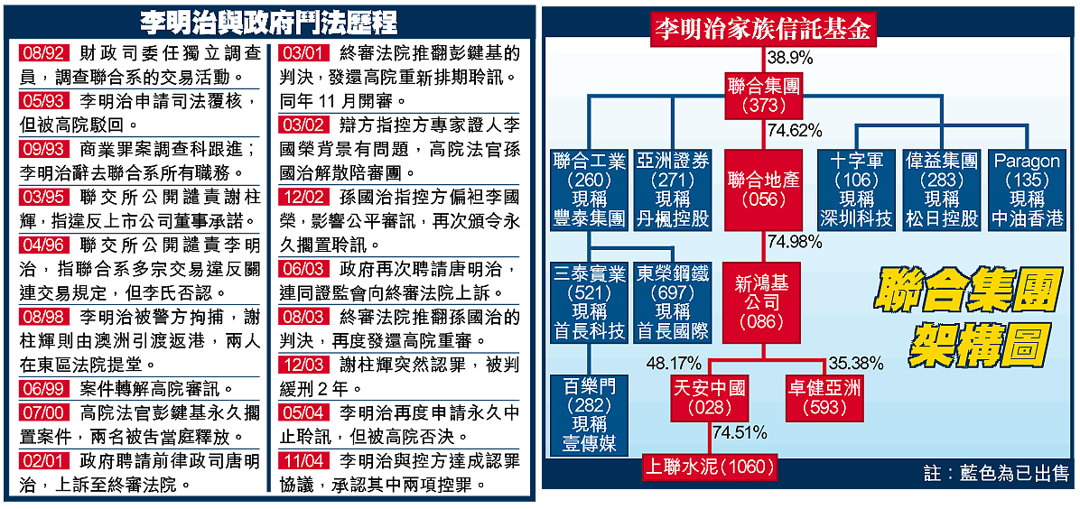 聯集案曾兩度申請終止聆訊,但兩次都被終審法院推翻,發還再審,高院原定上月26日重審,但控辯雙方近日達成認罪協議。李明治原本被控6項罪名,指他在90至92年間串謀詐騙,以及發表虛假陳述及帳目,他昨日對其中2項串謀詐騙及2項虛假陳述不認罪,只承認2項虛假陳述罪,涉及91至92年間,在聯集的90及91年度兩份公司財務報表及兩次股東周年大會上,發表虛假聲明及帳目,聲稱90年配售3.2億股聯集股份所籌集的3億元已全數收取現金,並反映在財務報表中,涉及誤導、虛假或欺騙,企圖欺騙股東及公司債權人。