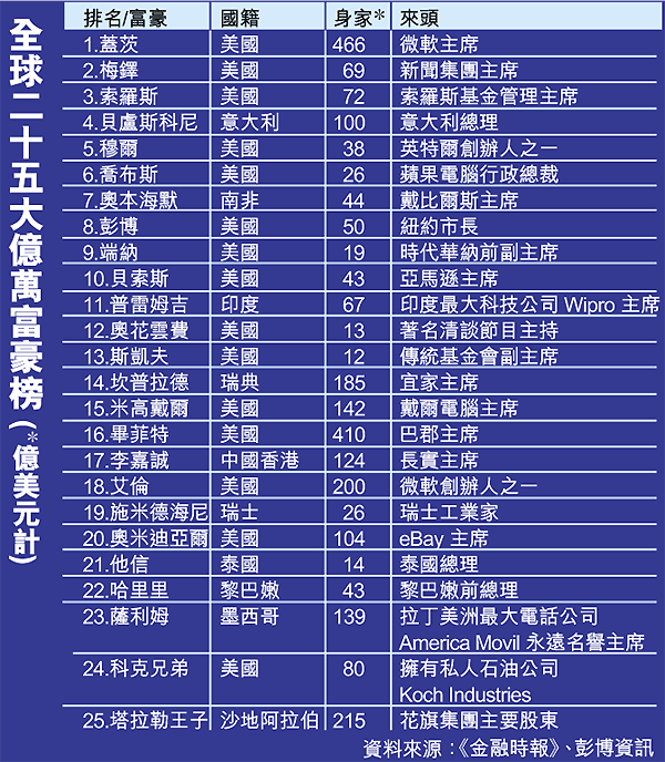 【本報綜合報道】英國《金融時報》發表全球二十五大富豪榜,全球首富、微軟主席蓋茨順理成章地高居榜首,至於本港長江實業主席李嘉誠則是唯一入選的華人。不過,單靠豐厚的身家並不足以上榜,富豪對社會的影響力和貢獻,也是《金融時報》主要考慮的因素。