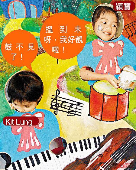 做法:在廁紙筒上畫畫,把廚房用紙巾用橡筋固定做成鼓面。