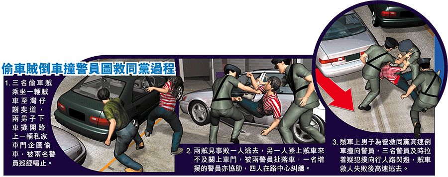 【本報訊】三名配備汽車偷車賊,昨清晨在灣仔街頭企圖偷車時遭警員撞破,其中一人逃脫,另一人企圖登上同黨接應賊車逃走但被警員扯落車,雙方在路中心糾纏。駕車賊人為營救同黨,無視法紀高速倒車撞向警員,三名警員拉着疑犯撲向行人路閃避,其中一名警員被車撞傷腳,賊車救人失敗後逃去。 記者:李家傑