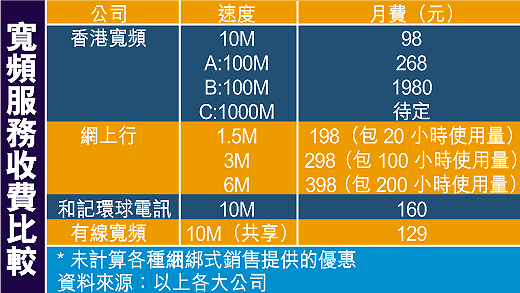 此外,香港寬頻更計劃於明年第二季推出BB1000服務,提供速度達1G(1000M)的寬頻服務,為全球最高速的同類服務。收費方面,BB100的月費為二百六十八元,簽約一年,可享用無限的100M本地接駁及20M國際接駁;而針對高頻需求用戶,香港寬頻特別推出本地接駁及國際接駁同為100M的服務,月費為1980元。