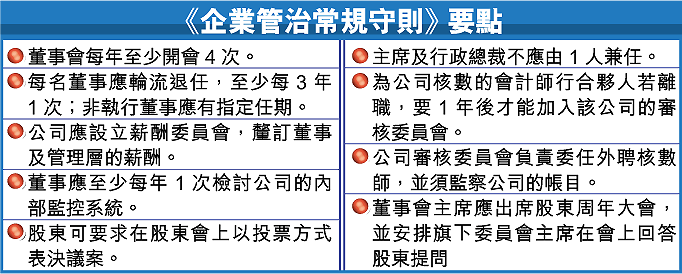 另外,港交所又修改上市規則,上市公司須在年報內刊載《企業管治報告》,講述公司履行新守則的情況。