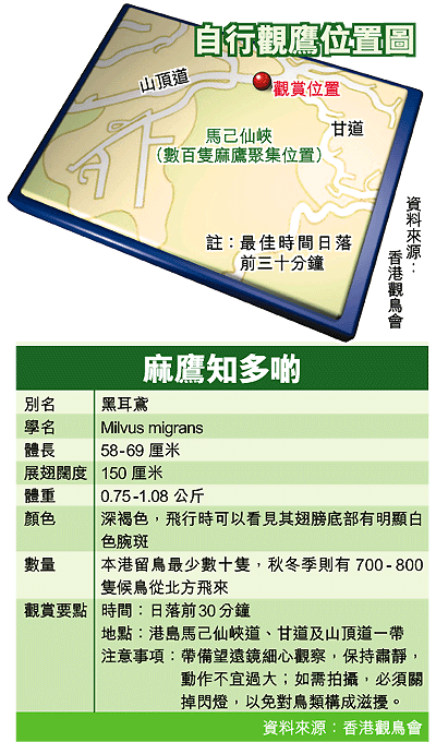 香港觀鳥會響應國際鳥盟,發起觀鷹團活動,帶領市民更深入認識這種朝見口晚見面的老朋友。數十市民昨日相約於日落時分,出發前往麻鷹聚居的「鐵竇」馬己仙峽。每年秋冬兩季,本港土生土長加上北方飛來歇冬的麻鷹,數字多達七、八百頭,除了馬己仙峽,昂船洲和大澳都是麻鷹晚上睡覺的露天大宿舍。