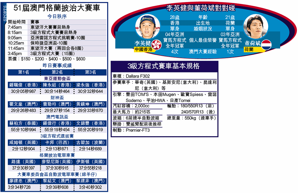 兩位最有機會成為首位F1華人車手的李英健和董荷斌,昨在澳門格蘭披治三級方程式資格賽發生互撼事件,意外導致兩人未能完成選拔賽;今日壓軸決賽大戰只能排在最後兩席起步,欲雙贏卻變雙輸局面。(無綫翡翠台今日3:20pm直播)