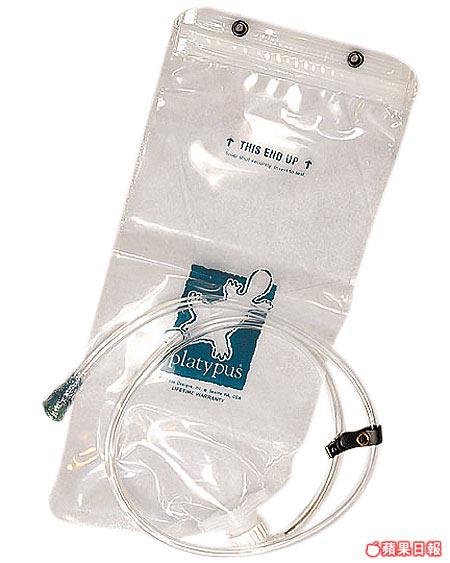 水袋容量為3L,特闊袋口注水方便容易。拉鏈式袋口封得密實,橡膠喉嘴可預防漏水,飲水時只需輕咬喉嘴便可。喉管附有膠夾,可將之夾在背囊肩帶上飲用。