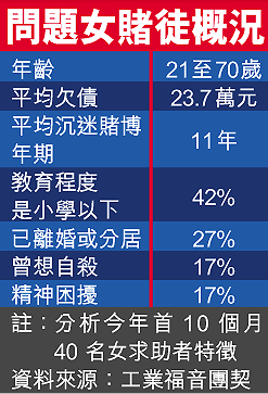【本報訊】「爛賭」的不只是男人,本港問題女賭徒人數不斷增加,賭博給她們和家人帶來的創傷往往比男賭徒嚴重。「工業福音團契問題賭徒復康中心」去年輔導的女賭徒人數,較前年大增七成。她們多是婚姻失敗,欲借賭博逃避現實,但較男士更易「上癮」,近兩成曾萌自殺念頭。工福副總幹事潘仁智指,社會不接受女性賭博,令她們羞於求助,一旦「爆煲」隨時發生倫常慘劇。 記者:雷子樂