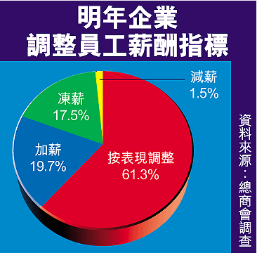 該會於過去一個月進行「商業前景問卷調查」,收回二百八十一份問卷。總商會首席經濟師歐大衛(DavidO'Rear)昨日在記者會上介紹,六成一企業將按員工表現調高員工薪酬,而近二成企業則會調高整體員工的薪酬,減薪企業只有百分一,近一成八為凍薪。而招聘員工方面,近五成增聘人手,只有百分九會裁員。