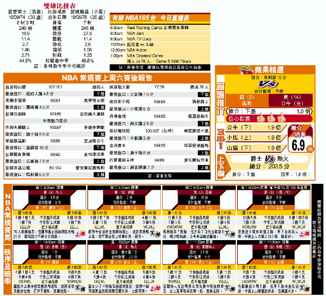 近兩戰平均得分逾四十分的奴域斯基今季各方面成績均有進步,且學懂不再單靠三分遠射得分,會藉「硬闖」博取罰球;加上搶籃板技術提升,在前場有力面對「雙華萊士」的挑戰。要知道小馬今季在奴域斯基拿取三十分或以上的八場比賽中,全獲勝利。談到後備力量,小馬擁有平均得十四分的史達侯斯及近四戰平均得十三分的泰利在陣,自然又要稍為秤先。