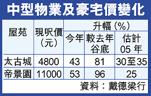 以二手指標屋苑比較(見表),豪宅帝景園現價較去年「沙士」期間谷底勁彈近倍,今年升幅超過五成,而中小型屋苑太古城現價較「沙士」期間升約八成,今年升幅逾四成。