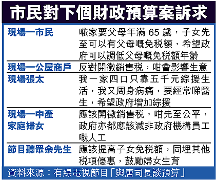 唐英年昨出席有線電視節目舉辦的「與唐司長談預算」公眾諮詢大會,吸引數百名市民出席,不少市民都要求財爺作出不同稅項優惠,包括降低父母免稅額的六十五歲年齡限制,以及提高子女免稅額,以鼓勵婦女生育,解決香港人口急劇老化問題,有公屋商戶要求政府不要開徵銷售稅,擔心會影響生意,反要求增加陸路離境稅,減低市民北上消費意欲,保障本地零售業。