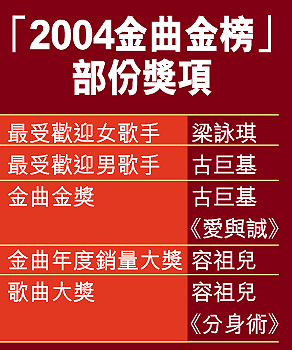 由廣州電台舉辦的「2004金曲金榜頒獎演唱會」前晚在廣州舉行,古巨基和梁詠琪(GiGi)分別獲「最受歡迎男、女歌手」獎,而未能出席的容祖兒則一人奪得五個獎項,成為整個頒獎禮的大贏家。