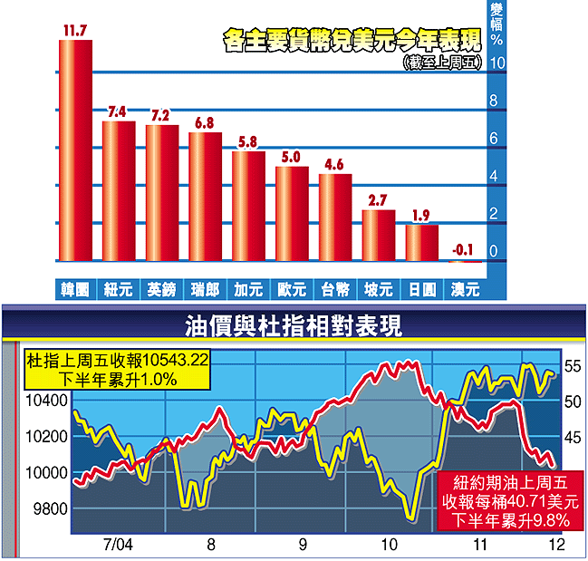 紐約1月期油上周五最多挫2.28美元(5.36%),跌至每桶40.25美元,為7月底以來最低價;收報40.71美元,跌1.82美元。倫敦布蘭特原油1月期貨收報每桶37.38美元,下滑2.29美元(5.77%)。全周計,紐約期油累計挫1.83美元(4.30%),布蘭特期油跌去1.98美元(5.03%)。
