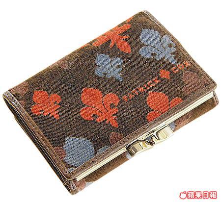 以桃紅色為主調的銀包,全個以羊皮製成,質地柔軟,配上童軍花的壓紋Monogram,顏色大膽奪目。散銀格以婆仔的啪鈕設計,是不少OL的心頭好。