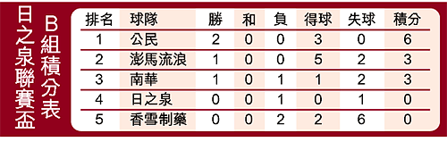 至於南華對日之泉的賽事,前者憑歐偉倫下半場初段博得十二碼,親自操刀下為球隊射入奠勝一球,以一比○擊敗日之泉。