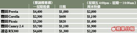 豐田租車部嘅聖誕優惠期由12月20日開始至明年1月7日,喺呢段期間租車滿一星期可享有優惠價,而且豐田嘅租車按金一向比較平,極抵玩。以最平最大路嘅Corolla1.5為例,一星期租車費$2,300,比平日嘅租價重平咗$200,另再畀$4,000按金即可攞車。除番開每日只係畀三百幾蚊,今個聖誕假期就可以做有車階級喇。