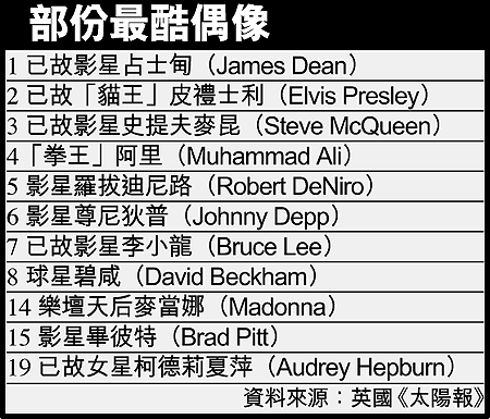 調查共選二十大最酷偶像,其中九人已作古,占士甸一九五五年車禍逝世時只有二十四歲;貓王七七年逝世時四十二歲;史提夫麥昆八○年癌症病逝,也只有五十歲;李小龍七三年逝世時三十二歲。