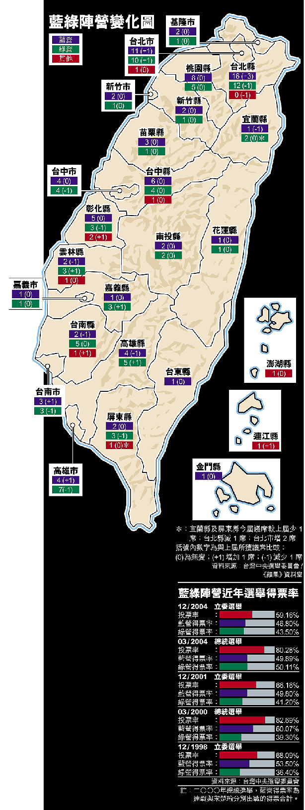 綠營爭取立院過半夢碎,僅奪得一百零一席,民進黨兩名高層為此請辭。不過,綜合島內分析,民進黨今次選戰失利,身兼民進黨主席的台灣總統陳水扁難辭其咎,陳水扁選前狂打制憲建國牌,激化藍營支持者的危機感,令藍營的配票策略得以成功,再加上綠營提名過多,導致同室操戈,最終未能挾今年三月總統大選的雷霆萬鈞之勢再攻下立法院。