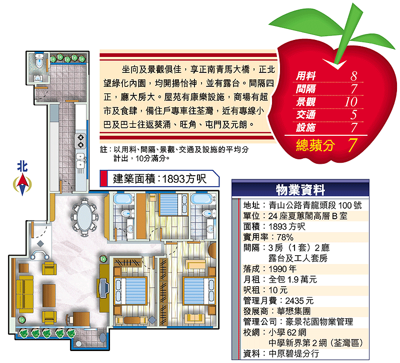 青山公路豪景花園有28座,當中以22至28座素質最佳,位處海邊,享180度闊景,盡覽青馬大橋及碧海藍天,日夜景色優美,使人看得心醉,單位俱逾千八呎,屬屋苑中最大碼,附露台,海風吹拂,欣賞雲霞海景,親親大自然。 這個24座B室,位處高層,景觀有氣勢。