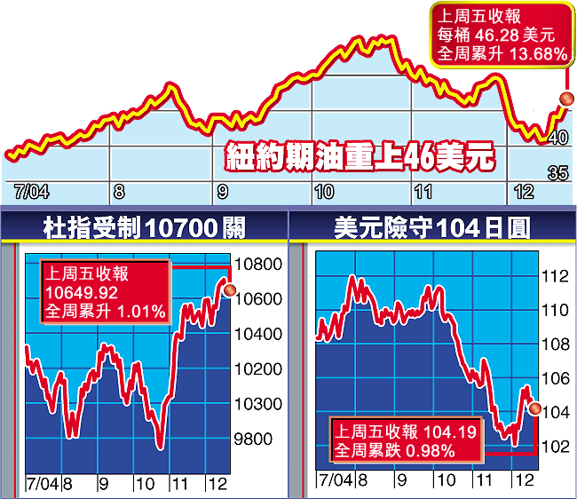 紐約原油1月期貨上周五升2.10美元(4.75%),攀上每桶46.28美元,是上月30日至今最高收市價;與10月25日的55.67美元紀錄高位相比,紐約期油已回吐16.87%,但年初至今平均價達41.39美元,為紐約期油自1983年開始買賣以來新高。倫敦布蘭特原油2月期貨反彈1.94美元(4.68%),升見每桶43.39美元的逾兩周高位。