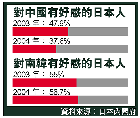 日本首相小泉純一郎近年多次參拜靖國神社,與中國又因釣魚台領土與東海能源糾紛不和,兩國關係明顯緊張。日本最新民意調查顯示,日本人對中國有好感的程度跌至二十六年來最低;相反,在「韓風」吹襲下,日本人對南韓愈來愈有好感。