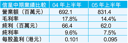 信星鞋業(1170)截至9月底的中期業績,營業額較去年同期增加20%至8.31億港元,但毛利率則按年下跌超過3個百分點,主要由於勞工及運輸成本增加,純利相應按年下跌約7%至6200萬元。
