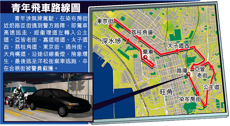 【本報訊】旺角昨凌晨上演一幕黑夜飛車追逐場面,一名青年涉嫌無牌駕駛,遇上警方路障即亡命逃奔,衝路障「玩轉」半個西九龍,沿途切線爬頭兼衝紅燈,險象環生;疾馳逾七公里後棄車逃跑,但終被警員截獲拘捕。 記者:伍浦鋒